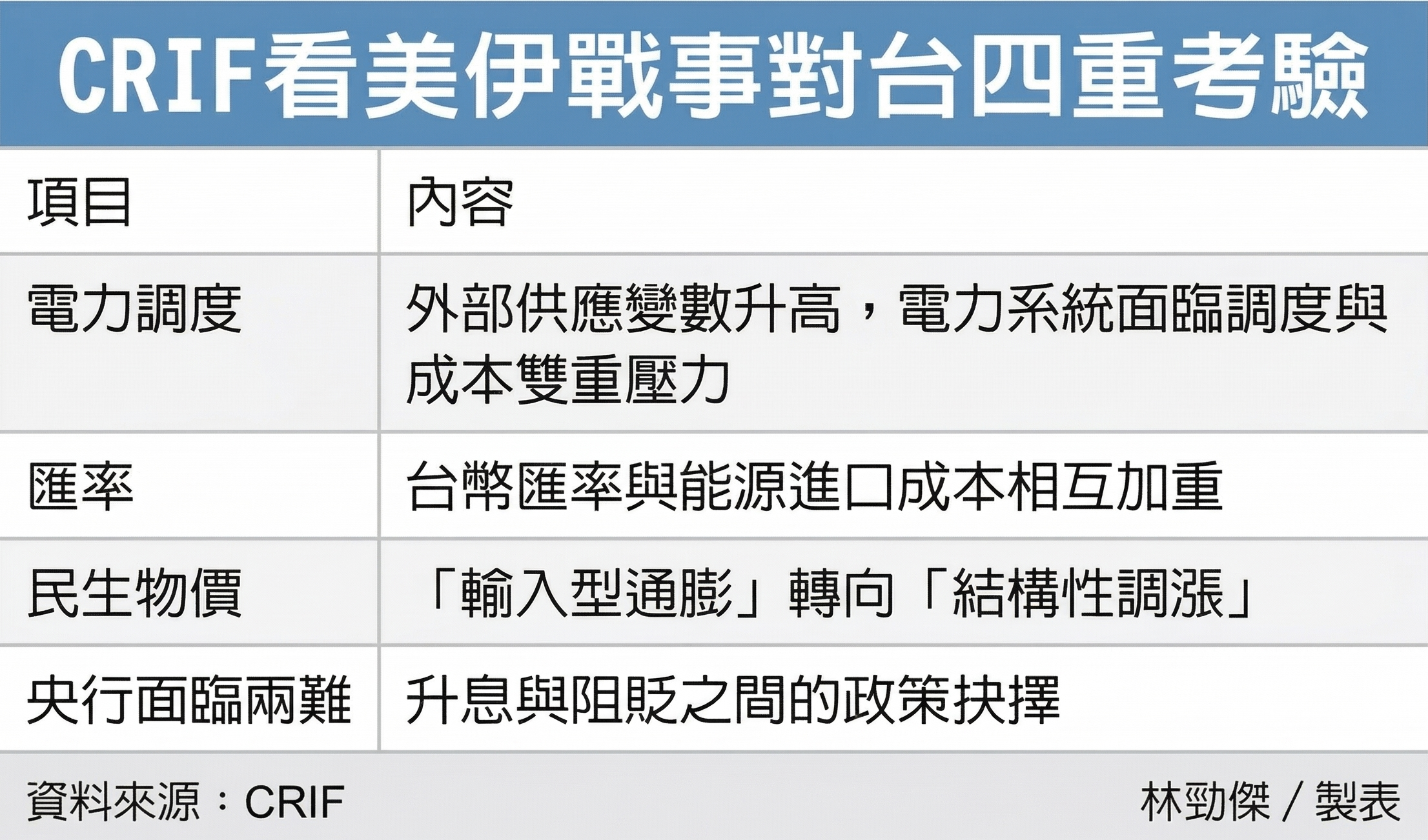 CRIF指出,台湾面临的挑战并非单纯「没有油」,而是「价格上涨且供应速度减缓」。外部供应变数升高,电力系统面临调度与成本双重压力。再者,新台币汇率与能源进口成本相互加重;新台币从31贬至32.5元时,同样一桶油企业同时承受油价涨幅与汇率贬幅加乘效应。自开战以来台币实质购买力已缩水3%至5%,推升输入型通膨压力。