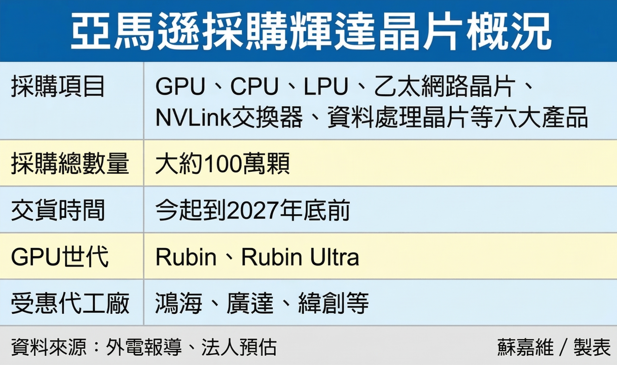 路透报导,辉达(NVIDIA)传出将在2027年底前向亚马逊AWS出售100万颗GPU晶片、语言处理器晶片(LPU)及网通平台等相关产品,并已经获得辉达证实,代表亚马逊AWS供应链的鸿海(2317)、广达、纬创等相关代工厂接单动能持续到明年。