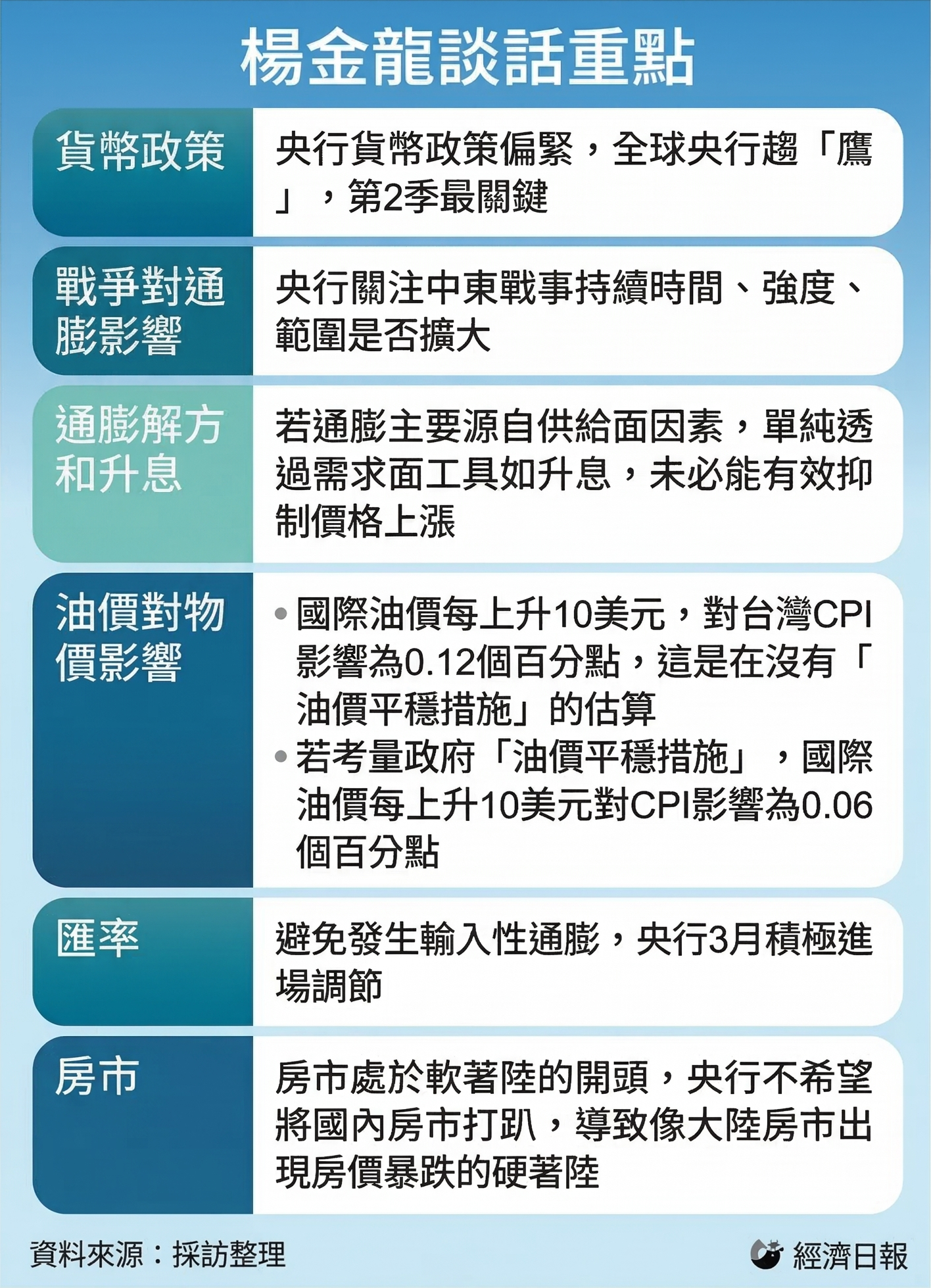 杨金龙说,根据以前的经验,中东战争不持久,因为对大家都不利,不过包括战争的长度、强度及范围是否扩大等因素,不仅牵动全球能源供应,也将直接影响通膨走势及市场预期心理。他强调,若通膨持续升温并形成预期心理,央行将采取更为审慎且偏向紧缩的货币政策,以维持物价稳定。