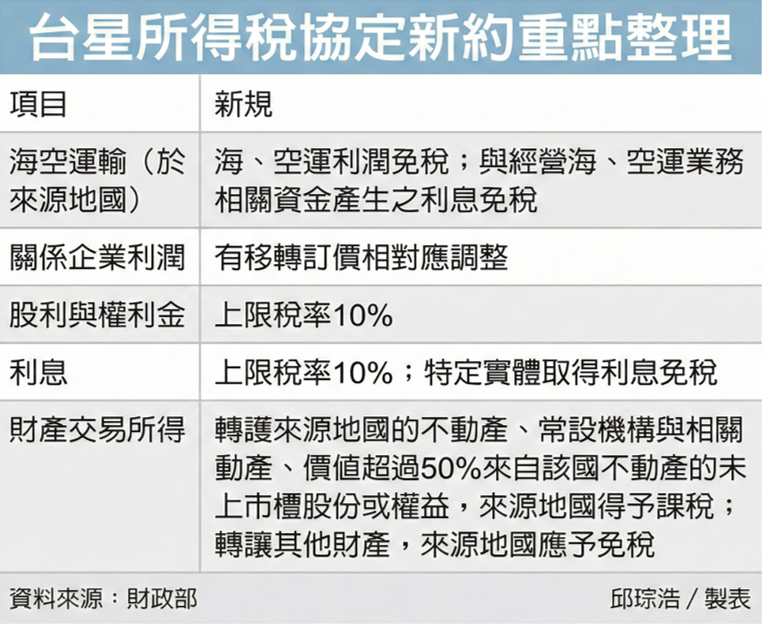 财政部表示,台湾与新加坡所得税协定新约日前已生效,将于明年元旦起适用,其中支付股利、利息与权利金可适用10%较低扣缴税率,特定利息支付可适用免税。专家分析,新约将有助降低双边跨境贸易投资障碍,提供更优质租税环境。
