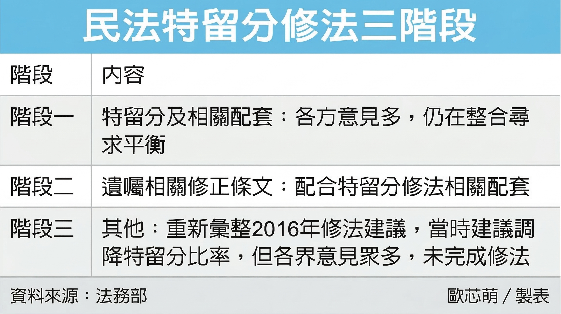 法务部曾于2016年提出修法,降低特留分比率,但当时各界对于代位继承、降低特留分比率、兄弟姊妹之法定继承人地位及其特留分,都有不同意见,最后未完成修法。
