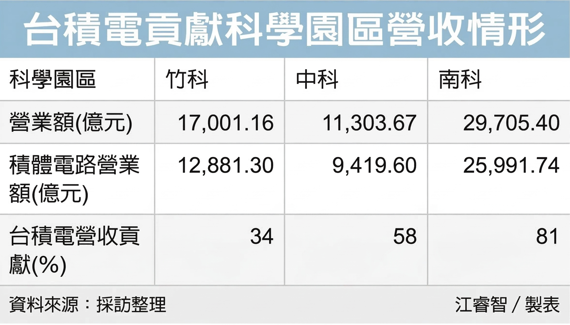 若观察三大科学园区,去年台积电营收对竹科贡献约34%,官员形容「相对健康、多元」;去年台积电营收对中科营收占比约58%,对南科营收占比则高达81%。