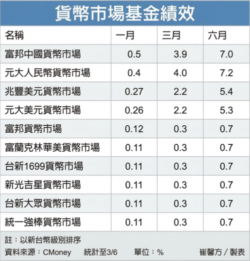 在资金避险需求升温下,货币市场基金表现稳健。观察近一个月绩效,富邦中国货币市场以0.5%表现居冠,元大人民币货币市场0.45%紧追在后,兆丰美元货币市场、元大美元货币市场也分别有0.27%与0.26%的表现。