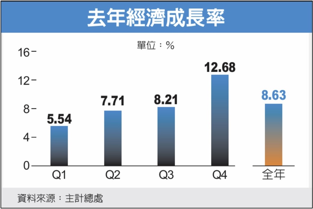 去年全年經濟成長率衝上8.63%,相較中國大陸的5%、新加坡4.8%、香港3.5%,以及韓國的1%,台灣經濟表現優於亞鄰國家。